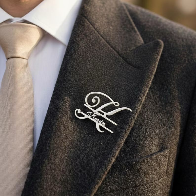 Make a statement that’s uniquely yours. This elegant custom initial brooch is crafted in a graceful script style, featuring personalized initials paired with a name for a refined yet contemporary look. Designed to elevate blazers, sarees, dresses, or lapels, it adds a touch of individuality and timeless charm.